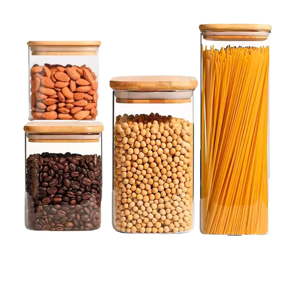 Conjunto de quatro potes herméticos com tampas de bambu que combinam funcionalidade e elegância. Os recipientes de vidro oferecem vedação segura, mantendo alimentos frescos por mais tempo, enquanto as tampas naturais de bambu agregam um toque sofisticado à sua cozinha. Ideais para armazenar grãos, cereais, café ou ingredientes secos. Design minimalista que se adapta a qualquer estilo de decoração, transformando a organização em uma declaração de estilo.